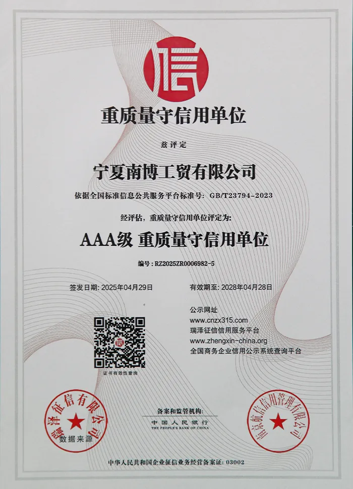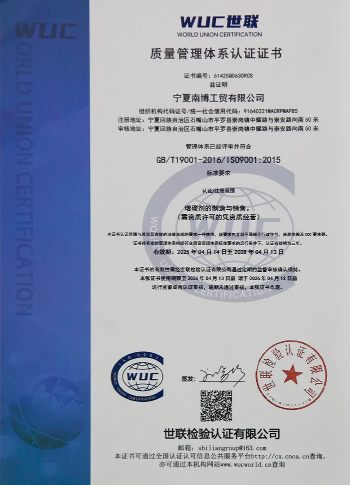 «Победа за счет качества, развитие на основе честности» — это долгосрочная цель компании. С целью «создания ценностной экономии для клиентов», опираясь на научные исследования и разработки в области углеродных технологий, используя системы автоматического управления для автоматической регулировки и оптимизации параметров, в соответствии со стандартами системы международного менеджмента качества ISO 9001 (версия 2025) и сопровождая деятельность высококачественным послепродажным обслуживанием, продукция ООО Нинся Наньбо Промышленность и Торговля, благодаря прямым поставкам сырья с месторождения и первоклассному качеству, продается на крупные сталелитейные предприятия по всей стране и получила единодушное одобрение от этих предприятий.