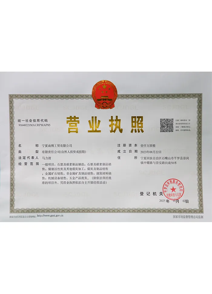ООО Нинся Наньбо Промышленность и Торговля было основано в августе 2023 года с уставным капиталом 10 миллионов юаней и занимает площадь 20 000 квадратных метров. Компания расположена в Промышленном парке Чунган уезда Пинло в Нинся. Находясь в известном во всем Китае и за его пределами месте производства антрацита Тайси — городском округе Шицзуйшань Нинся-Хуэйского автономного района, компания использует преимущества уникального месторождения угля Тайси в горном хребте Хэлань для производства, продажи и переработки углеродных материалов и продукции на угольной основе. Производственная линия компании оснащена передовым оборудованием и технологиями, в наличии имеются две новые высокоэффективные печи обычного обжига с 15 ретортами, а также полный комплект различного вспомогательного производственного оборудования.